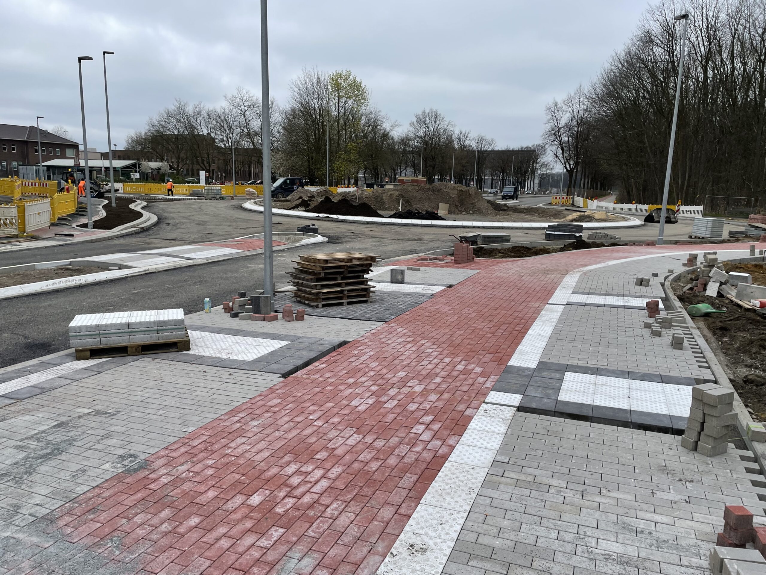Die Arbeiten auf der Großbaustelle gate.ruhr im Stadtteil Marl-Hamm schreiten zügig voran. Besonders sichtbar sind die Veränderungen an der Carl-Duisberg-Straße, der Flurstraße und dem nördlichen Kreisverkehr. Ende April kann der Verkehr auf den Fahrbahnen wieder rollen.